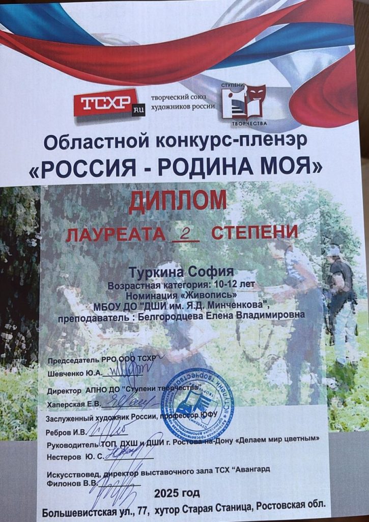 В конкурсе-пленэре приняла участие и преподаватель Е. В. Белгородцева. Елена Владимировна была удостоена диплома лауреата первой степени.