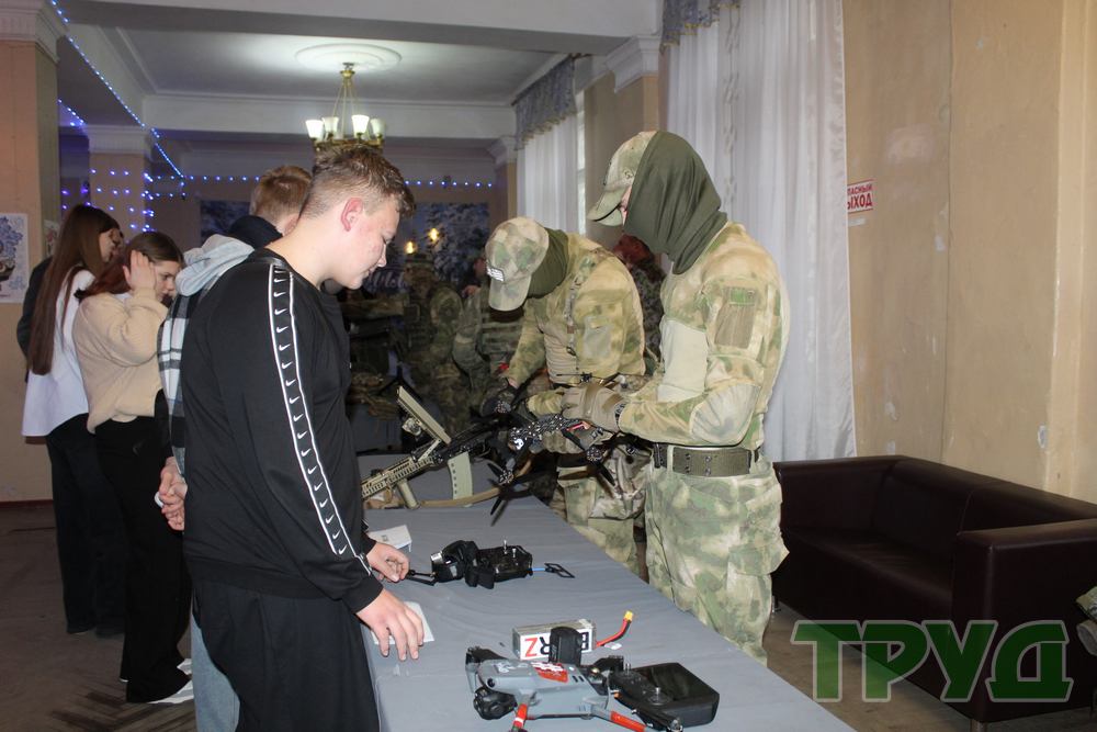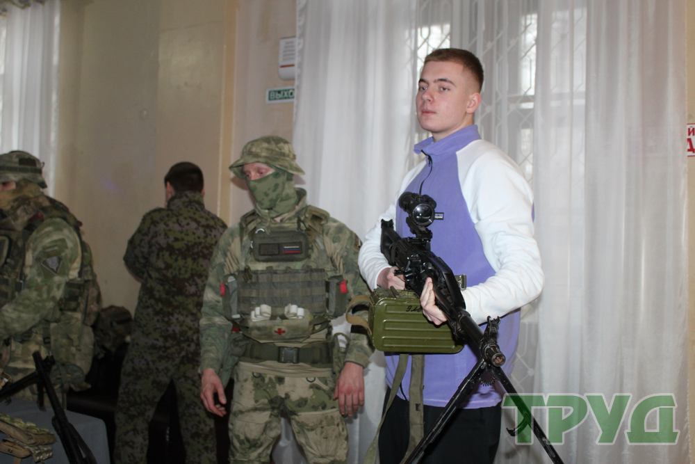 В фойе гостей встречала выставка военной техники и оружия. Мальчишки с увлечением расспрашивали военнослужащих об особенностях применения в пограничном деле беспилотных летательных аппаратов и тепловизоров, И конечно, самые смелые не упустили возможность примерить бронежилеты и «прицелиться» из снайперских винтовок.