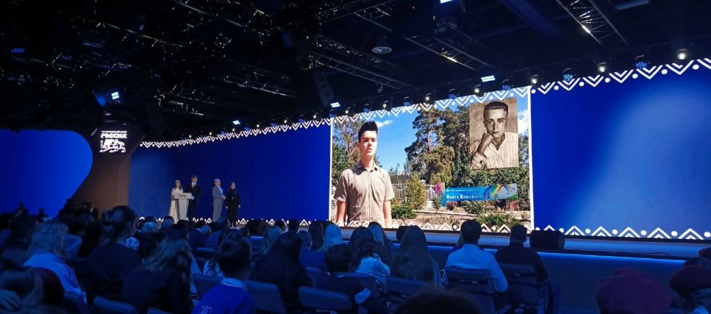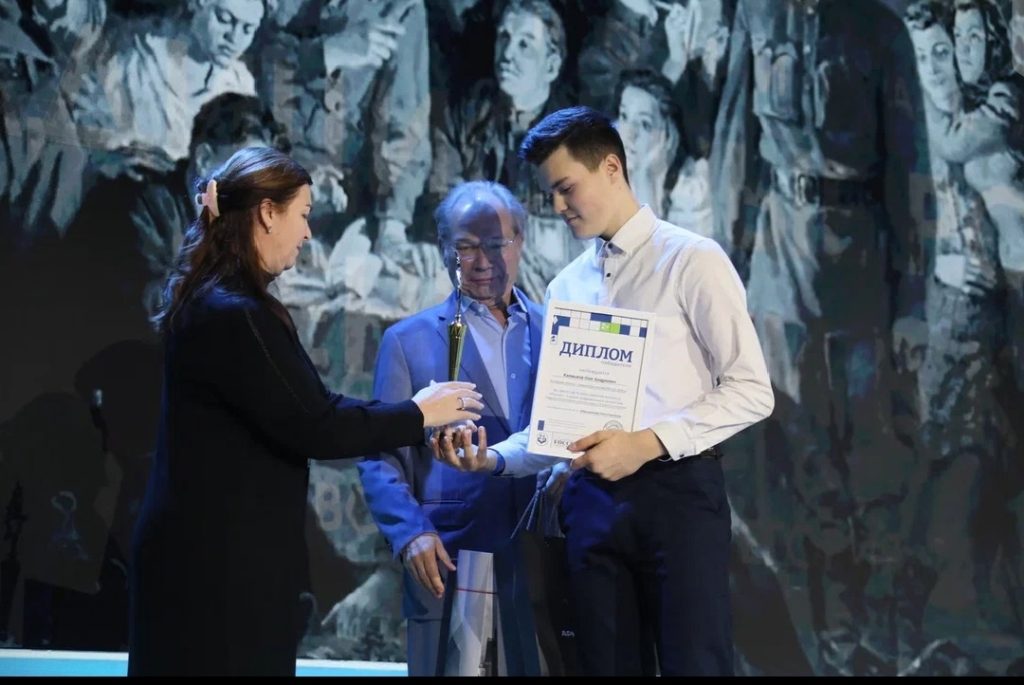 Обучающийся объединения «Исследователь» Каменского детского эколого-биологического центра Олег Калмыков в сопровождении руководителя О. С. Мирошниковой принял участие в церемонии награждения. Работа Олега в номинации «Видеоролик», раскрывающая ценность понятия «Патриотизм», посвященная подвигу Олега Кошевого, попала в проморолик открытия.