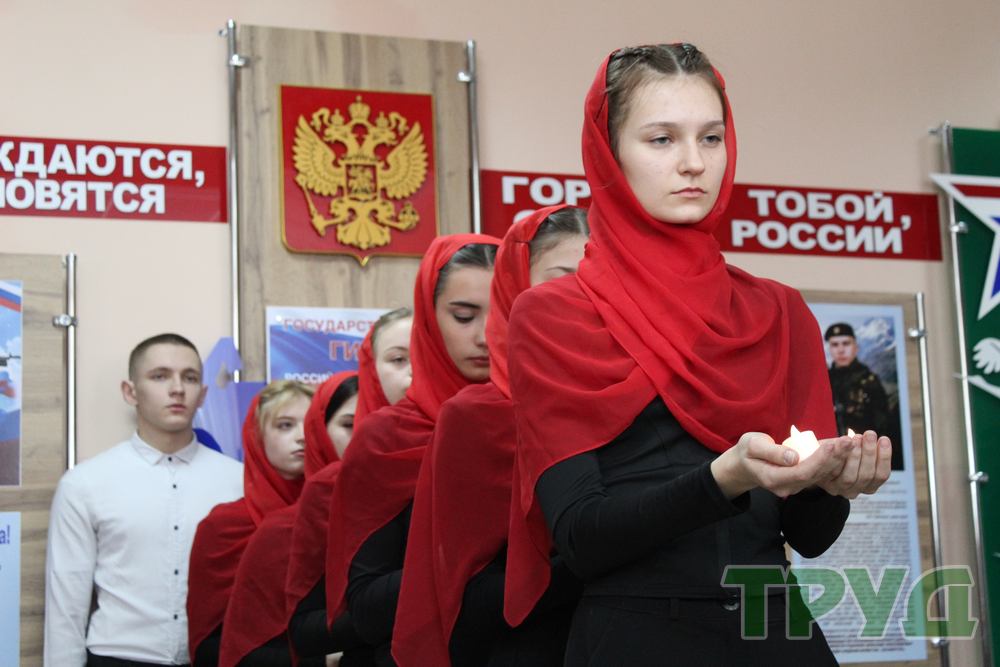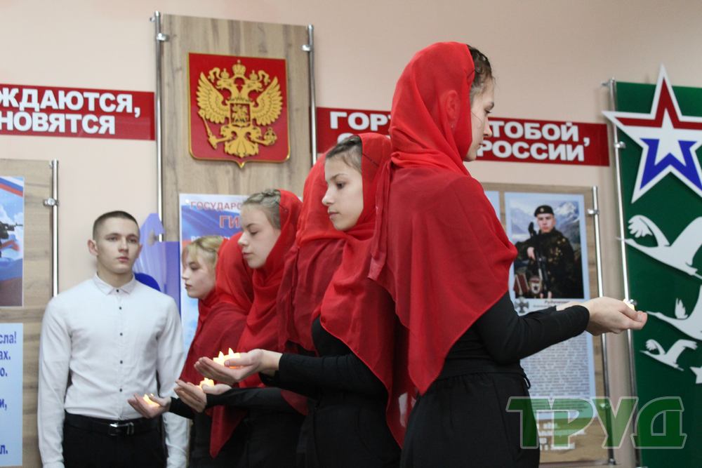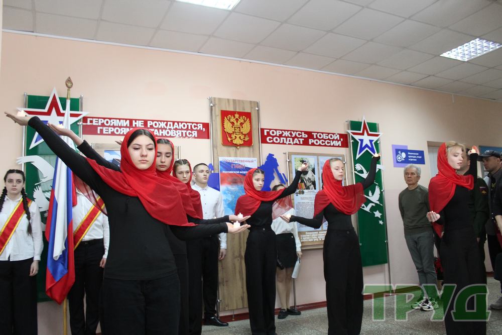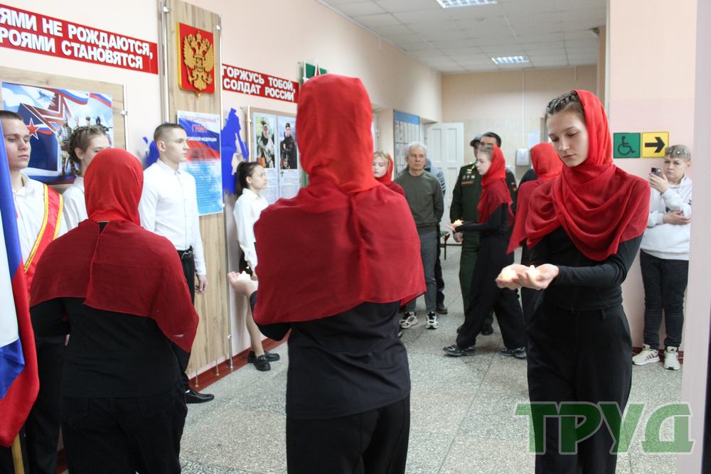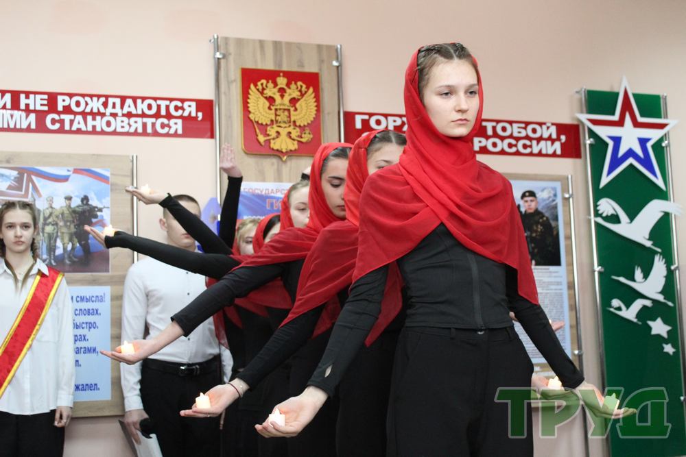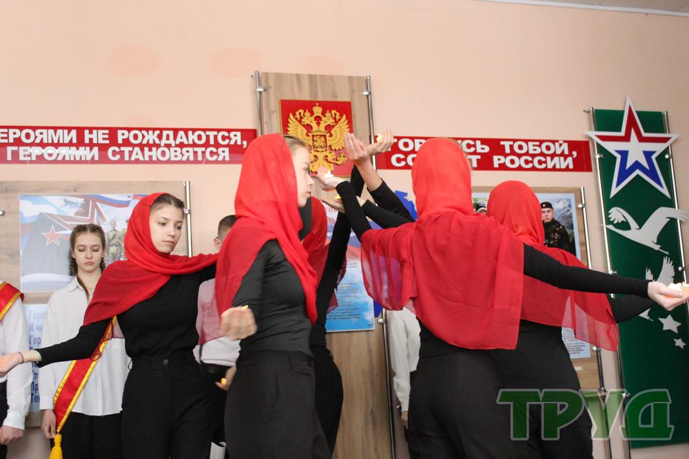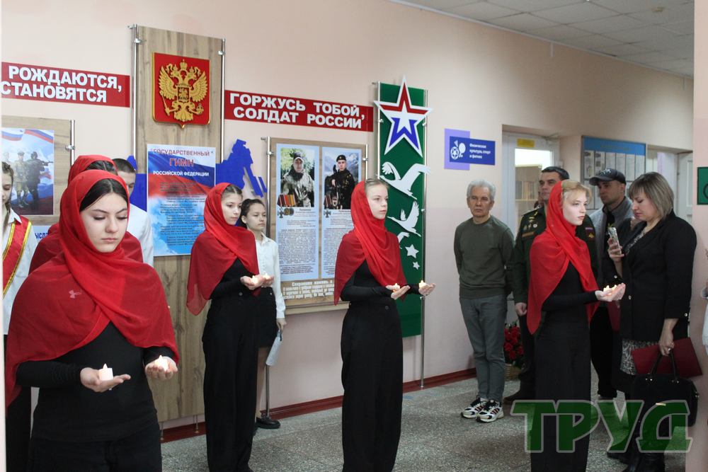 В завершение мероприятия студентки педагогического колледжа выступили с музыкальной композицией, после чего все собравшиеся почтили память павших воинов минутой молчания и возложили цветы к фотографиям бойцов.