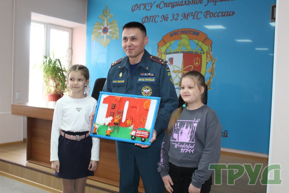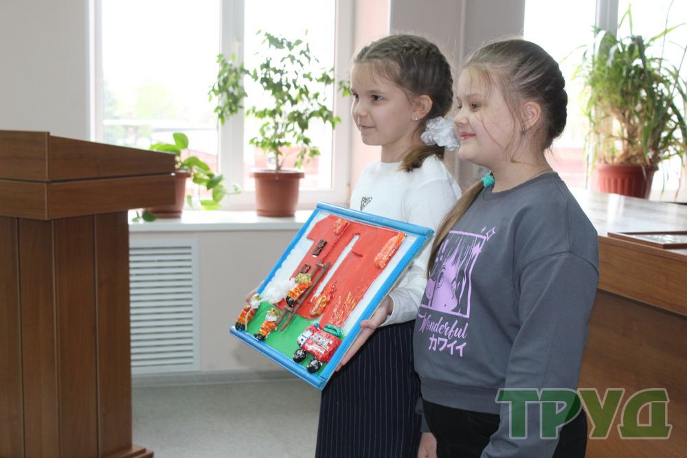 Ребята подготовили для огнеборцев трогательные поздравления с праздником и открытки. Также школьники передали в музей спецуправления поделку.